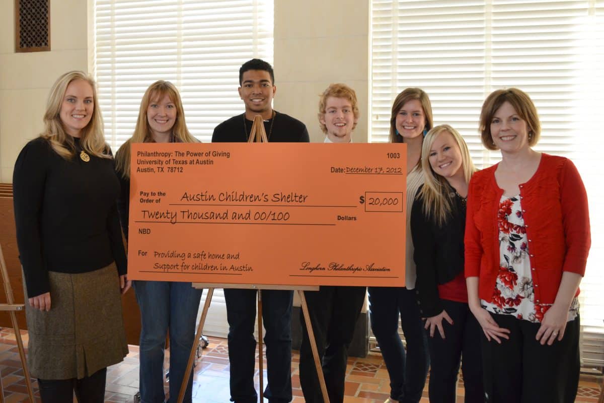 This holiday season, students from The University of Texas at Austin are giving back in a big way. Freshman enrolled in the “Philanthropy: The Power of Giving” signature course capped off their semester by giving away $100,000 to five charitable organizations at a check presentation ceremony on Monday, Dec. 14.