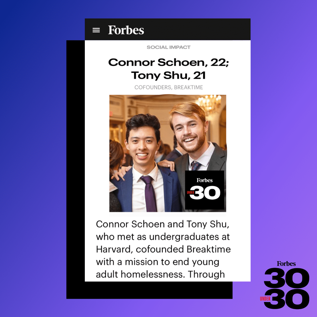 Connor Schoen and Tony Shu, who met as undergraduates at Harvard, cofounded Breaktime with a mission to end young adult homelessness. Through purposeful transitional employment, Breaktime empowers young adults experiencing homelessness to build sustainability in their lives while building resilience in their communities. During the first 8 months of the pandemic, Breaktime employed 25 young adults experiencing homelessness who led the preparation and delivery of over 500,000 meals to people experiencing food insecurity in Boston–all while earning a living wage and developing career-launching job skills. Breaktime is backed by the City of Boston, Liberty Mutual, BlackRock, and hundreds of other partners.