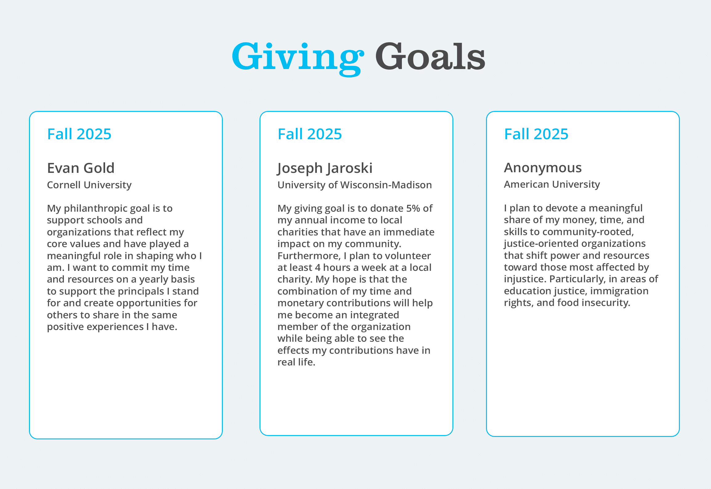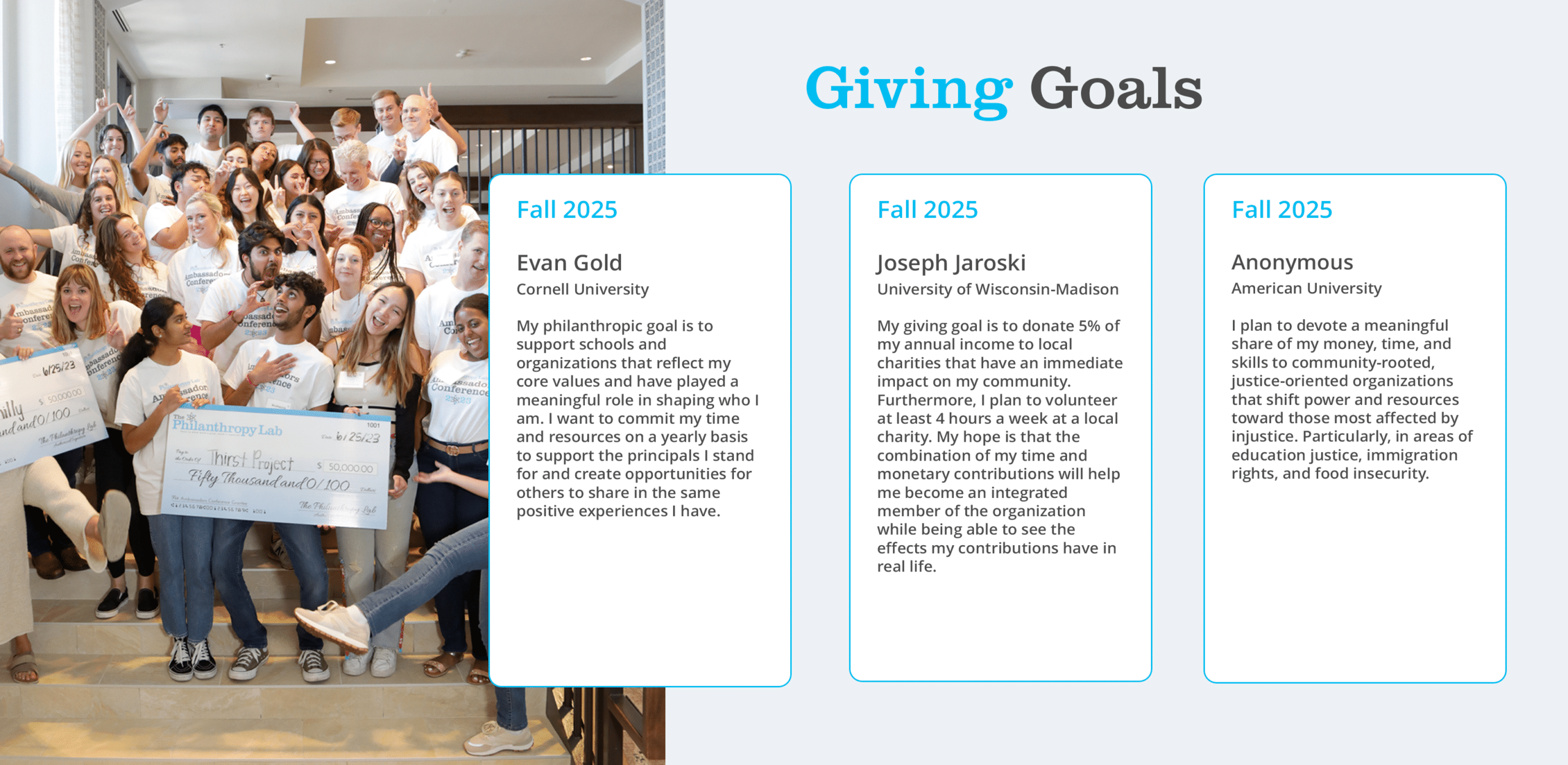 Share a brief statement of your Giving Goals on The Philanthropy Lab’s portal as a way to inspire others to do the same. You may post anonymously to the public if you wish.